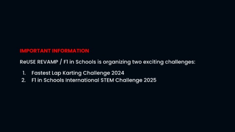 IMPORTANT INFORMATION ReUSE REVAMP / F1 in Schools is organizing two exciting challenges: 1. Fastest Lap Karting Challenge 2024 2. F1 in Schools International STEM Challenge 2025